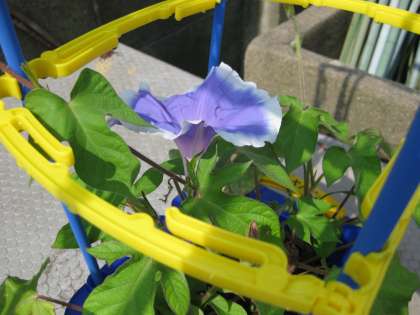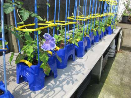 先日、1年生がアサガオのつるを添え木にはわせていましたが、早いものはアサガオの花が咲き始めました。