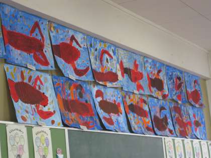 先日もお知らせしましたように、飼育・観察から、図工ではモデルになって大活躍のザリガニ君ですが、その作品が出来上がりました。