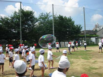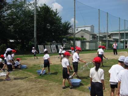 梅雨の晴れ間のグランドで団扇の枠を使用して、ジャンボなシャボン玉を作り出しました。シャボン玉がすぐに割れた子、いつまでも飛んでいる子とそれぞれですが、とても大きなシャボン玉ができました。