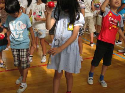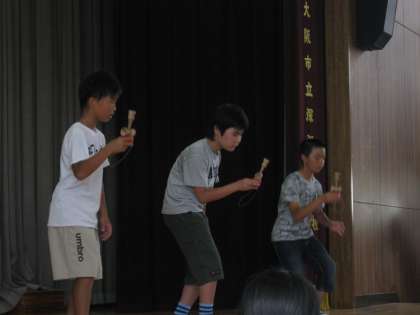 けん玉委員会の皆さんのお手本を見て、今日の集会のスタートです。