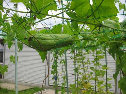 6月にこの花はどんな実をつけるでしょうか?とクイズを出しましたが、回答をいたします。それはヘチマでした。でも、瓜のように大きい実がなりました。