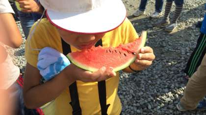 焼き板も完成し、おやつタイムです。高原で食べるスイカはあまくてとってもおいしいです。これから、入浴、夕食と続きます。今日の星はきれいでしょうか。ナイトウォークが楽しみですね。