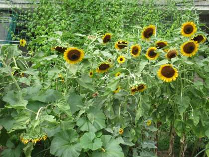 写真は本校のゆうゆうテラス横の花壇のひまわりですが、東日本大震災で甚大な被害を受けた福島県浪江町のひまわりです。本校の管理作業員さんが今年になってから種から育てたものです。たくさん花を咲かせました。「花は咲く」の歌にあるように、生命の大切さと永遠の命を感じられます。年々このヒマワリが大きく育ち、また増えていくことを願っています。(学校長)