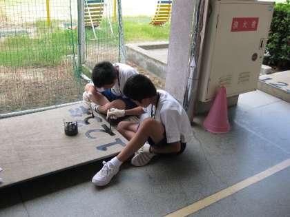 台風一過で少し気温が下がったものの、まだまだ暑い中、一生懸命に取り組んでいます。この2日間、塗装業務と運動場の整備に励んでいます。(安全管理のため本校の管理作業員がいつもそばについています。)