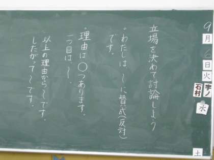賛成と反対の理由について、自身の意見を述べる学習をしています。