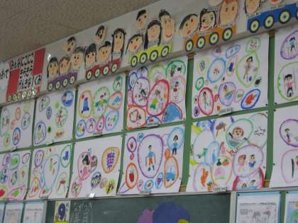 1年生の教室の後ろに張り出されている夏休みの「絵日記」と「絵画」です。一つひとつに夏の思い出がつまっています。
