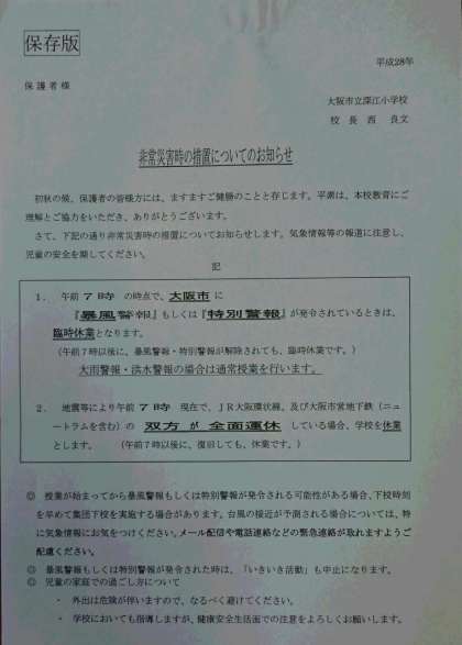先日、「非常災害時の措置について」でお知らせいたしましたが、今後の気象情報等に注意し、外出には危険が伴いますので、なるべく避けるなど児童の安全を期してください。