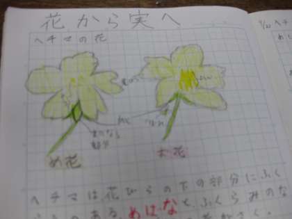 ヘチマの実のなるまで、おしべとめしべの受粉のようすを学習しています。
