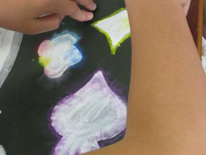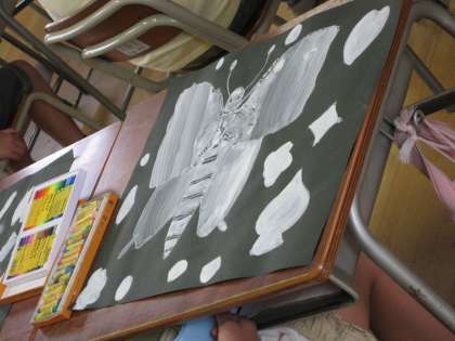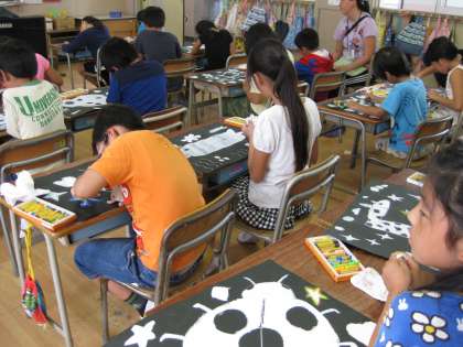 デッサンした下絵の上にクレヨンで色付けをしているところです。