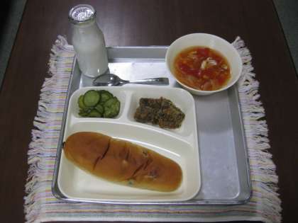 献立:ミラノ風カツレツ、ミネストローネ、きゅうりのサラダ、パン、牛乳