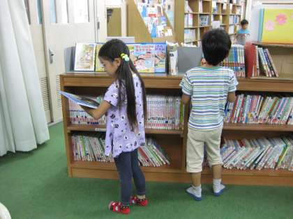 図書館活動です。1年生が自分で本を選んで、借りるまでを学習しています。