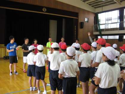 最後は班ごとにボール送りゲームをおこなって締めくくりました。とてもわかりやすくていねいなご指導をいただき、テニスというスポーツに興味と関心を持つことのできたひと時でした。