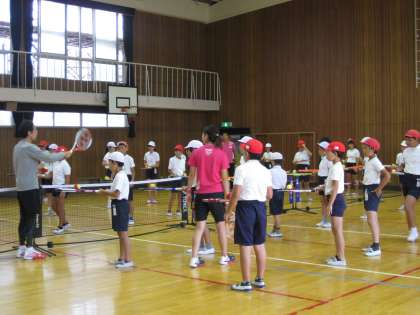 3時間目は5年生、4時間目は6年生と学年ごとに分かれて授業を行いました。テニス未経験者の多い中、ボールとラケットに慣れることから始まり、インストラクターとの簡単なラリーができるようになるまでご指導をいただきました。