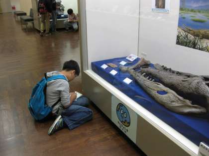マチカネワニの標本の前では座り込んでメモを取る熱心な子どももいました。将来は研究者か学芸員になるかも・・・
