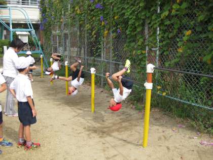 1組は「鉄棒」です。「足がかかりました。その調子。」