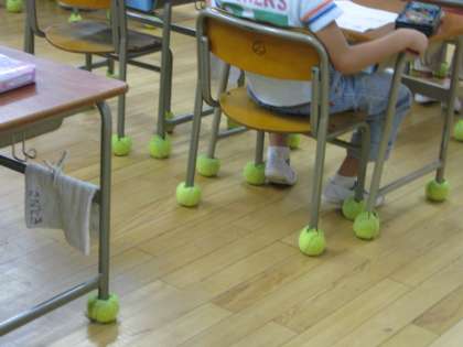 現役生活を終えて、使用できなくなったテニスボールは教室の防音材としてこのように活用され、静かな教室作りのために一役かっています。皆さん、テニスボール君に感謝しましょう!