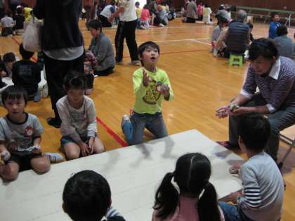 ことぶき会の方々講師にお迎えして、1・2年生が昔遊びを教えていただいているところです。「お手玉」の様子です。