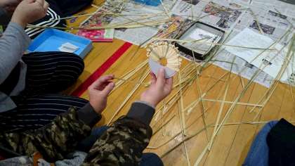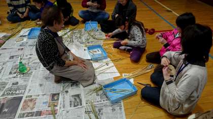 4年生の学年集会で、菅細工保存会の方々に来ていただいて菅細工のコースターをつくりました。はじめは、なかなかうまくできませんでしたが、時間とともに手が慣れてきてうまくできるようになりました。菅田植えから菅田刈りを経験して、深江の伝統の菅細工に触れることができる素晴らしい時間でした。