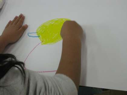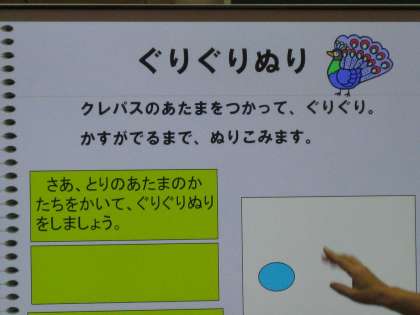 最初に「ぐりぐりぬり」です。では、クレパスをもって「ぐりぐりぬり」を始めましょう。