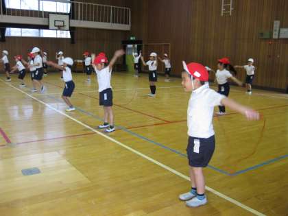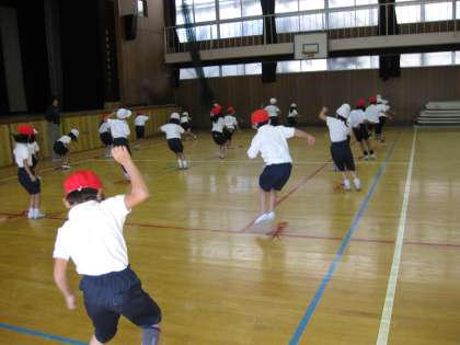 1年1・2組合同でなわとびの練習をおこなっています。(写真中・下)
