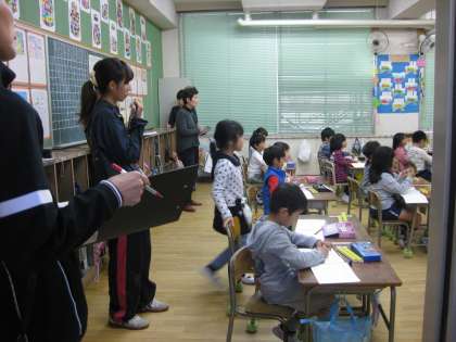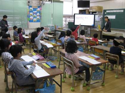 いつもと違った様子に最初は落ち着かなかった1年2組でしたが、すぐに雰囲気に慣れていつもどおり元気に手をあげていました。