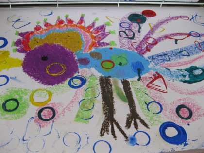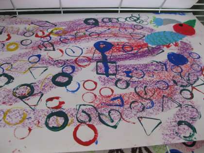 これまで取り組んできた1年生の絵画作品が完成しました。一部をご紹介します。どの作品もカラフルで創造的です。