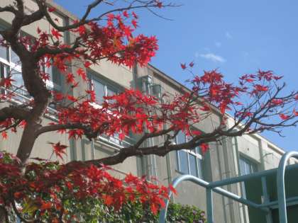 今年は夏暑く、秋が短かったこともあり、ひときわ校庭のモミジの紅葉があざやかに感じられます。校庭の身近な秋を感じられましたが、もう足早に冬がやってきました。