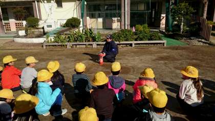 1つ目のチームは、水消火器を使って、消火器の扱い方を実際に体験しました。消火器から出てくるのは水でしたが、狙いを定めて水をかけようとみんな真剣に取り組んでいました。