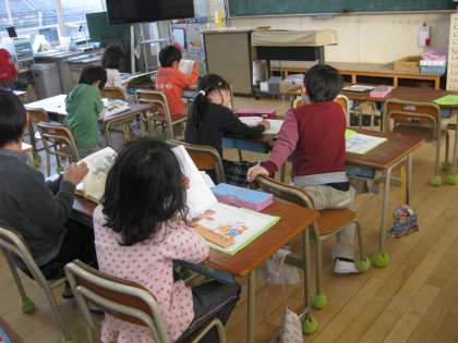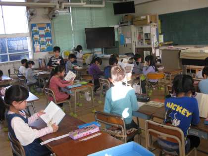 今週は読書週間です。1時間目が始まる前に各自選んだ本を静かに読んでいる1年生の様子です。