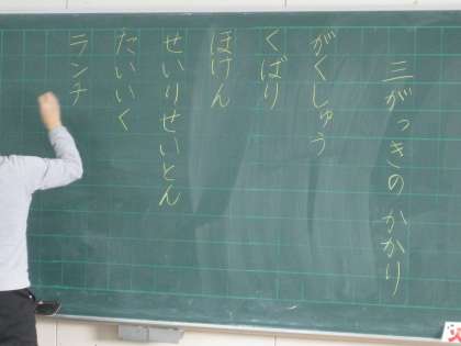 教室のかかりの分担票をみて、3学期の新しい「かかり」を決めています。
