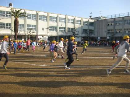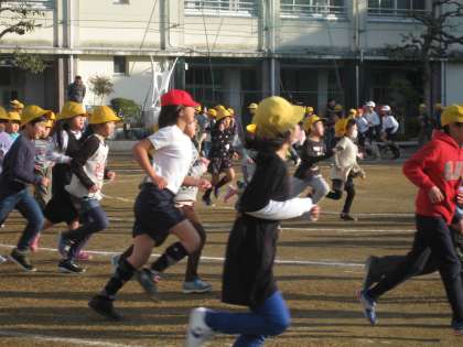 始業時前に校庭へ全校児童が集合し、先生の号令に従って5分間のかけ足をおこないました。円の中心側は低学年、外側は高学年でグランドに引かれたトラックを周回します。