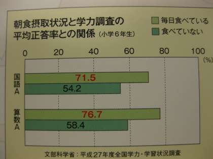 毎年、国が実施している全国学力、学習状況調査においても「早ね、早起き、朝ごはん」を守っている子どもほど、20ポイント近くも成績が良いという結果が現れています。