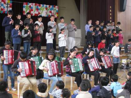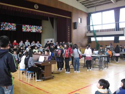 在校生からのプレゼントと寄せ書きが6年生に贈られました。そして、6年生からはお礼の言葉と合奏と合唱が在校生にありました。