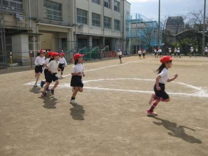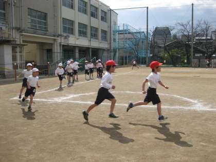 体育の準備でしっかりとランニングをおこなっています。準備体操やランニングで体をよく慣らしてから運動をおこなうことで、ケガの予防にもつながります。
