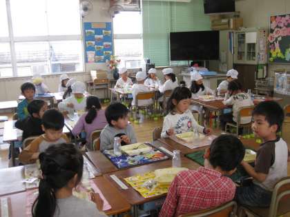 1年生の給食の様子です。もうすっかり完食でした。大好きなカレーライスを何杯もお代わりした児童もいるようです。