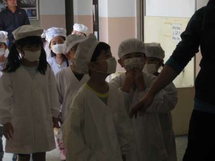 今日の給食はなんだろう?給食当番が給食を運んでいる様子です。