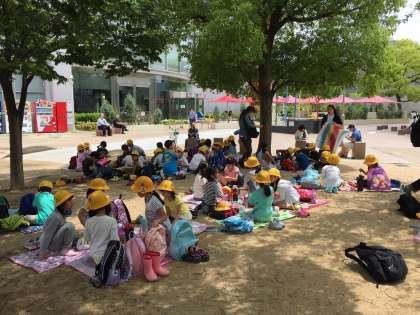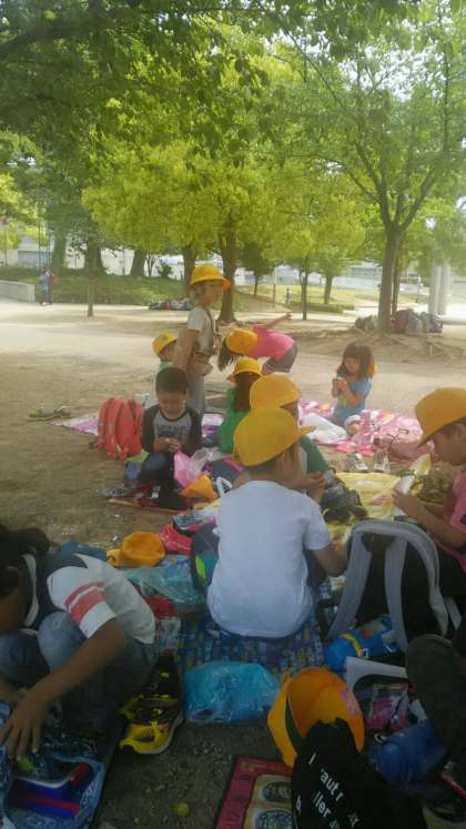 たくさん遊んで、公園でお弁当です。みんなで楽しくいただきます。