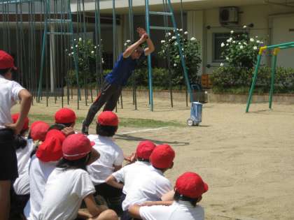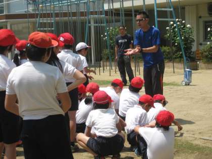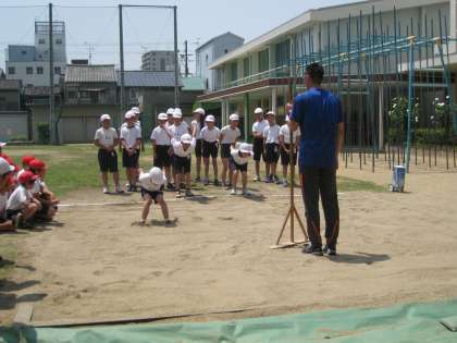 陸上の走り幅跳びで、日本選手権3度優勝、世界陸上2回出場、先日のワールドマスターズゲームス世界大会で優勝の実績を持つ、荒川先生より「立ち幅跳び」の直接指導を受けた5年生たちです。たった45分(立ち幅跳びは20分)のご指導でしたが、記録が目に見えてよくなっていく様子がわかりました。