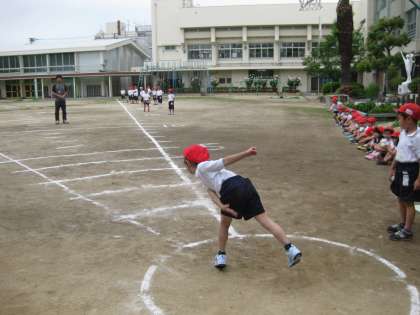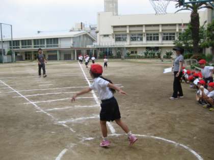 ソフトボール投げの様子です。本校の1年児童の平均は5m〜10mの範囲ですが、中には10m以上投げる児童もいました。
