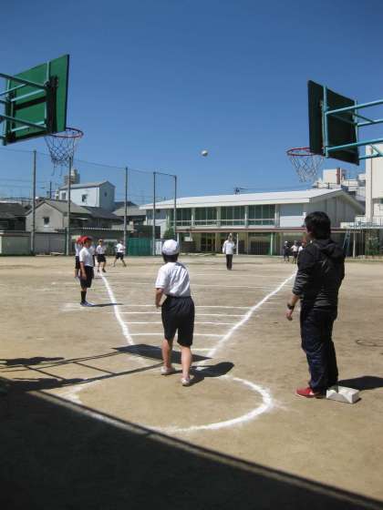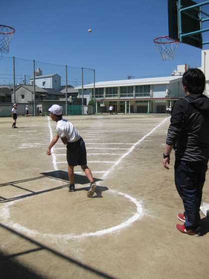 5年のソフトボール投げの様子です。狭い校庭いっぱいまで投げる児童もいました。