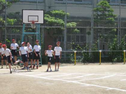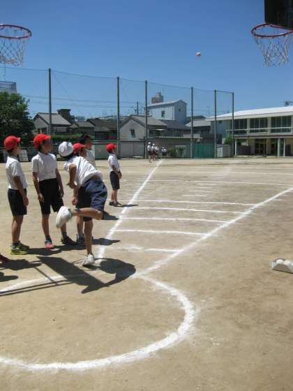 6年生のソフトボール投げの様子です。みんなが見守る中、青い空にボールが吸い込まれていきました。50mオーバーのようです。