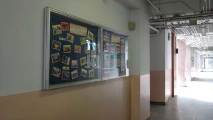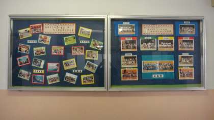 校長室前の学年掲示板に6年生のこの1年間の行事写真と6年生が入学してからのクラス写真を掲示しています。小さかった1年生の時からの成長の様子がよくわかります。