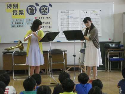 まず最初に大阪芸大の辻先生とお二人の講師のご紹介があり、続いてフルートDUOの演奏が始まりました。曲目はビヴァルディの「四季」、続いてみんなが知っている「さんぽ」演奏に合わせて一緒に歌いました。