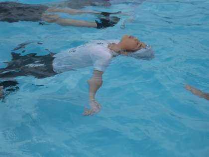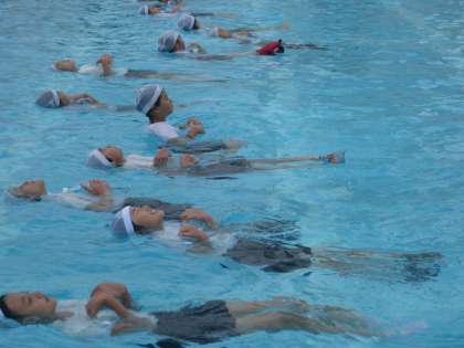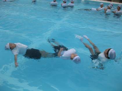 水難事故を想定して、着衣泳をおこなっています。最初は何も持たずに自力で浮く。次にペットボトルの空を抱える。そして、そのペットボトルをシャツの中に入れて浮く。それぞれの感覚を身に着けていきます。非常時を想定したものですが、いざというときにできるか、また、そういう人を発見したらどうするかを学びましょう。