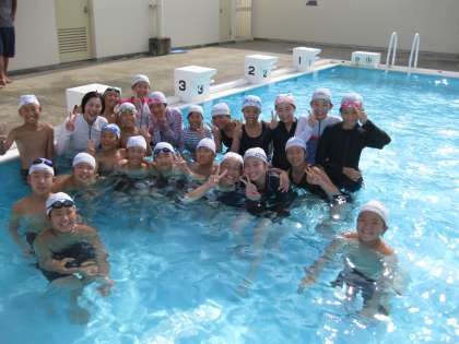 後半は児童と一緒にプールに入り、泳ぎの基本を教えた。「周りとの競争ではなく、あせらずに」「手のかきは体の近くで」など、実践的な教えに児童も真剣な表情で取り組んでいた。