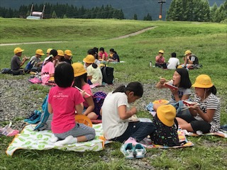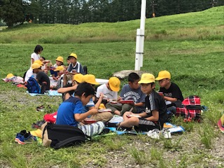 開舎式を終えて宿舎前の高原で、昼食のお弁当をいただいている5年生たちです。