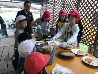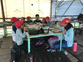 午前中の山登りでお腹はぺこぺこです。班ごとに声をそろえて「いただきまーす。」