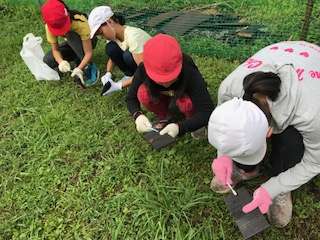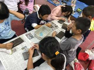 野外料理で作った昼食のカレーライスでお腹を満たした5年生は調理場のお片付けをした後、焼き板の製作に取り掛かりました。