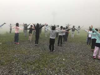 雨は降っていませんが、霧が出てきました。霧の中でのラジオ体操でした。