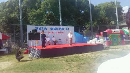 8月5日(土)6日(日)に東成区民まつりが開催されました。6日(日)は東中本公園で催し物が行われました。地域の方々が多数参加され、暑い中で地車でのお囃子やおでんなどのバザーや展示などしていただきました。